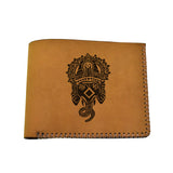 - This leather wallet is hand-cut and hand-stitched from natural leather without use of any machine which gives it a very simple but unique look. This one is suitable for all kinds of occasions. Especially, the wallet is burned pattern onto the surface that makes the wallet look more unique. To this kind of leather type, the scratch makes item look retro style, and it is easy to deal with, if you don't like the scratch on surface. This wallet will be the best choice when you need more than just a simple card wallet. This is a simple, clean, traditional design wallet including six card slots, one bill pocket with full size, and ID window, made with high quality durable leather to meet your daily needs.