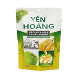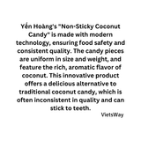 Yen Hoang Coconut Durain Coffee Milk Candy Coffee Made in Vietnam 100g bag. Yến Hoàng's "Non-Sticky Coconut Candy" is entirely produced using modern technology, with automated, closed-loop processes that ensure food safety. The candy pieces are uniform in weight and size, guaranteeing consistent quality. They feature the characteristic rich, aromatic flavor of coconut. This innovation represents a significant improvement over the traditional, hand-crafted coconut candy, which has been produced for centuries, often with inconsistent quality and a tendency to stick to teeth.