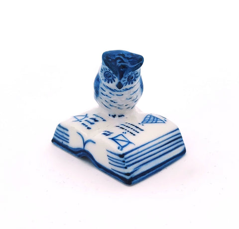 Blue Owl Bird On the Book Figurine Ceramic Tiny Handicraft Miniature Dollhouse